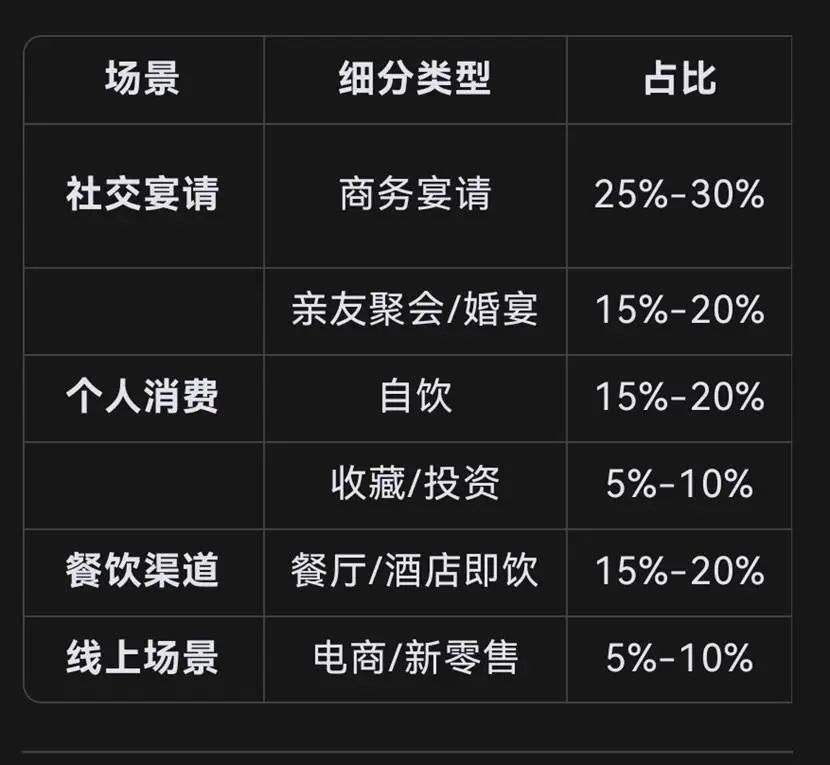 酒是人际交往的润滑剂。这是酒类消费的本质。当然,不排除部分人是上瘾的。图1中,个人消费只占15%-20%,其它都可视为社交性消费。