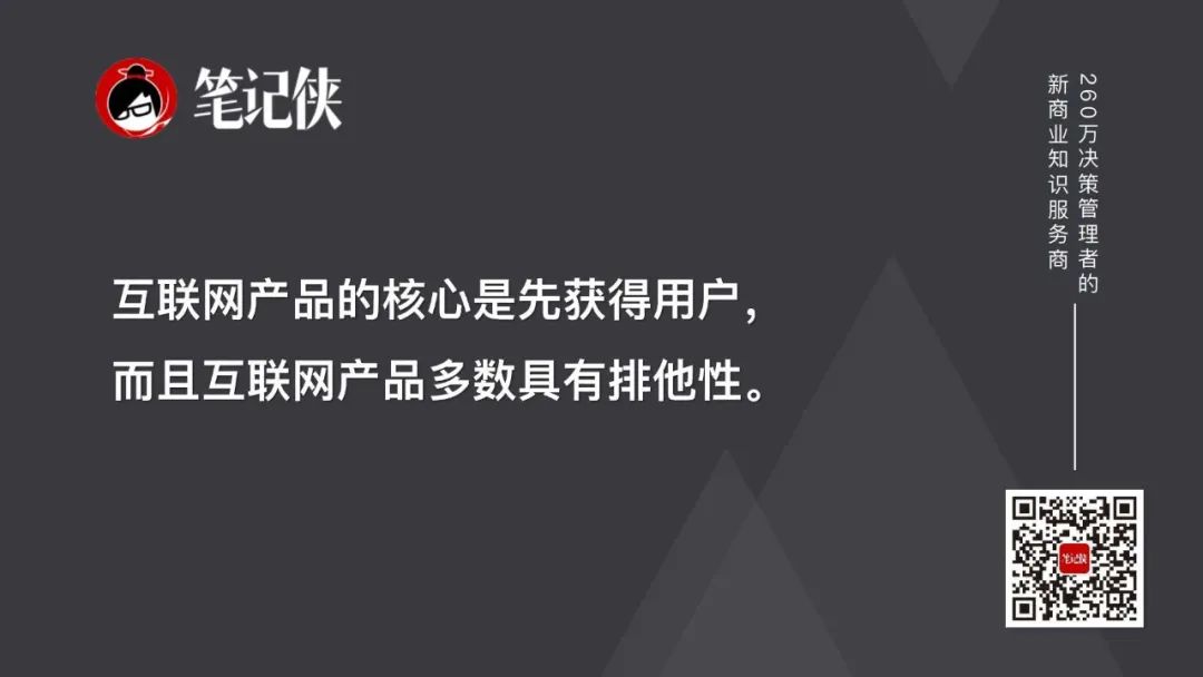 所以,互联网产品的核心是先获得用户,而且互联网产品多数具有排他性:今天用了搜狗,就不会再用百度;今天用了微信,就不会再用“来往”。既然是排他性的东西,就必须会产生垄断。