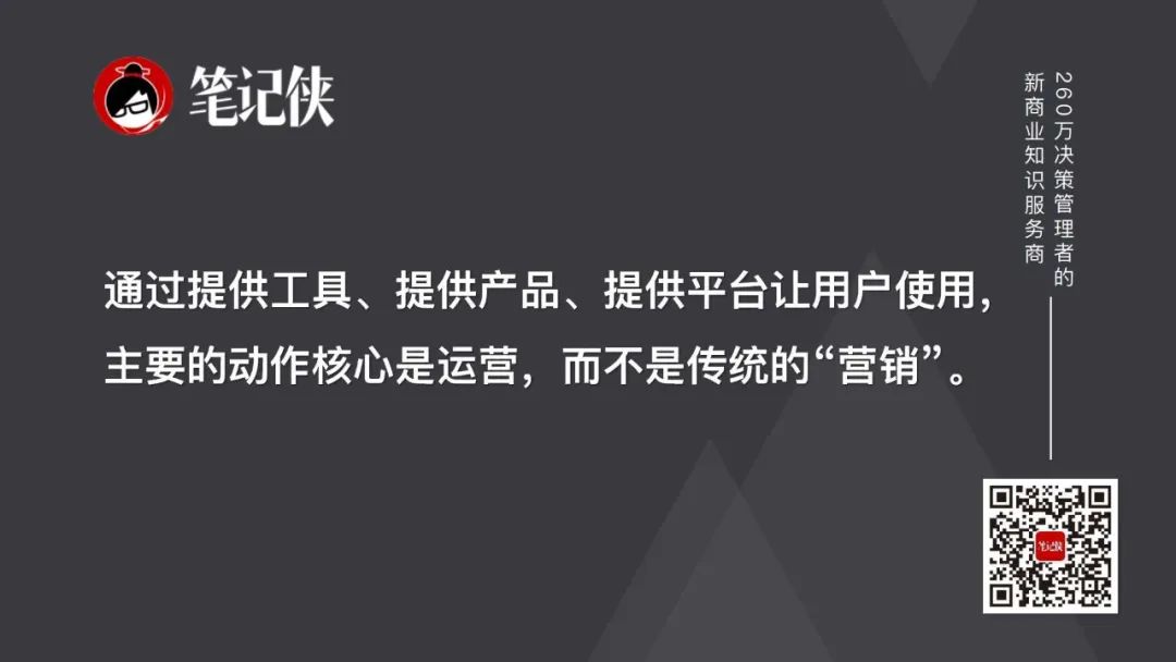 通过提供工具、提供产品、提供平台让用户使用,主要的动作核心是运营,而不是传统的“营销”,这就是今天互联网产品通常的打法。