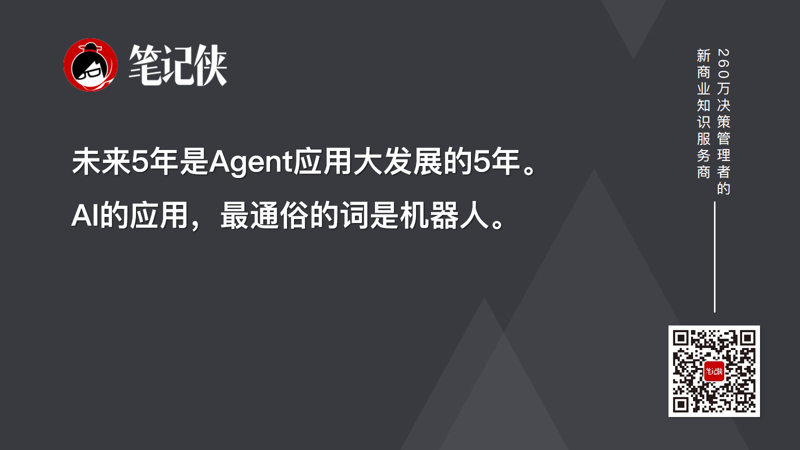 未来5年是Agent(智能体)应用大发展的5年。AI的应用,最通俗的词是机器人。