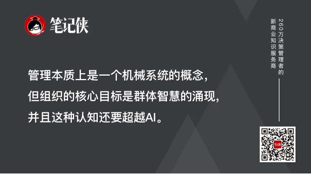 另外一点也非常重要:管理本质上是一个机械系统的概念,但组织的核心目标是群体智慧的涌现,即一群人如何创造出超越个体的认知,并且这种认知还要超越AI。