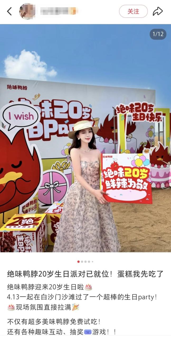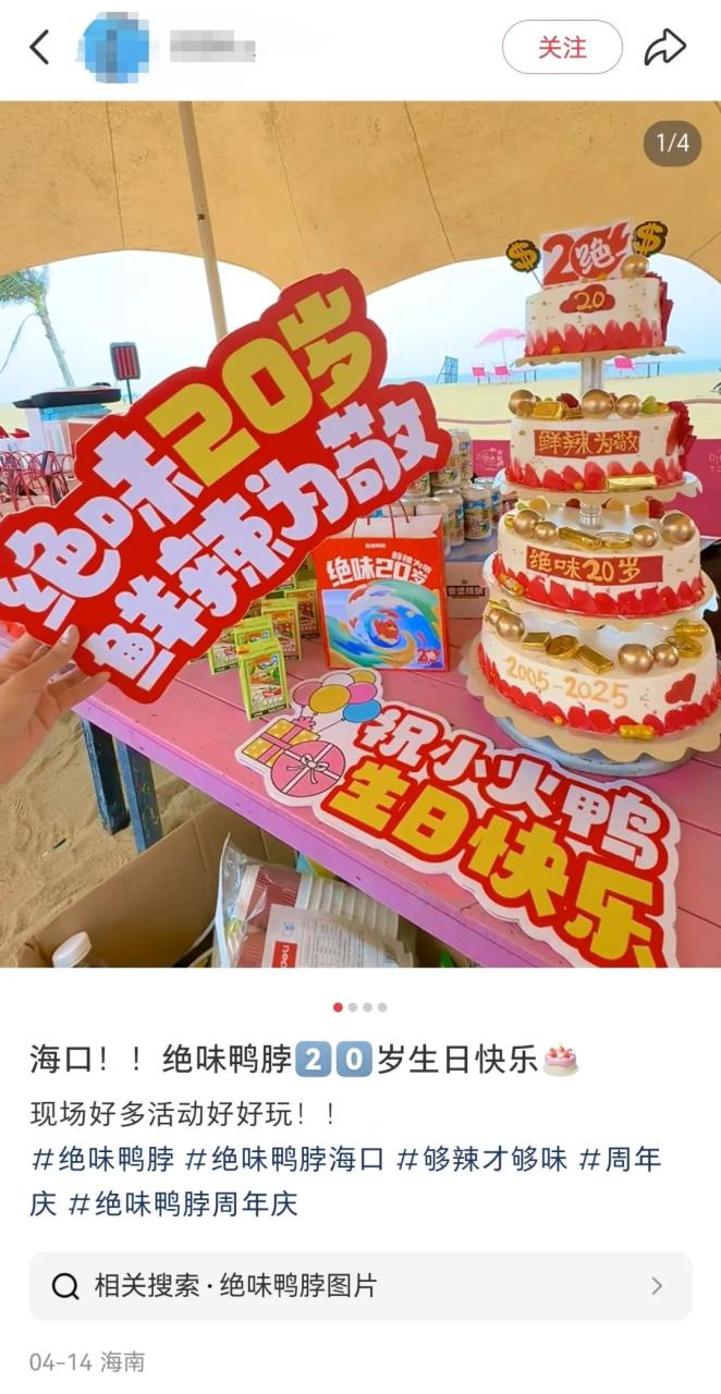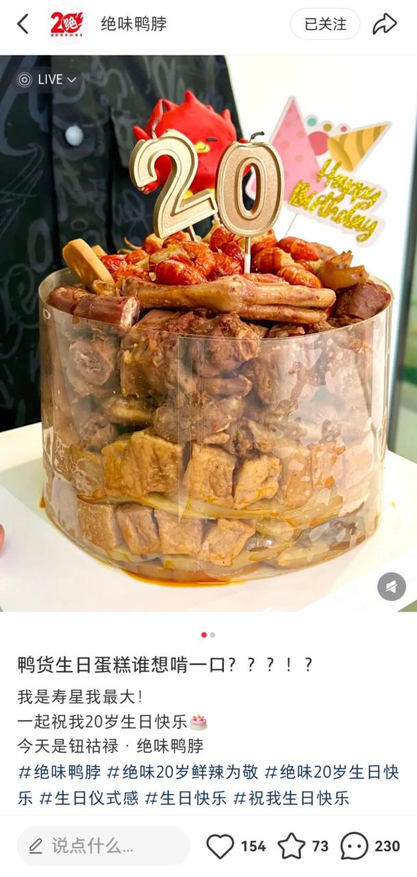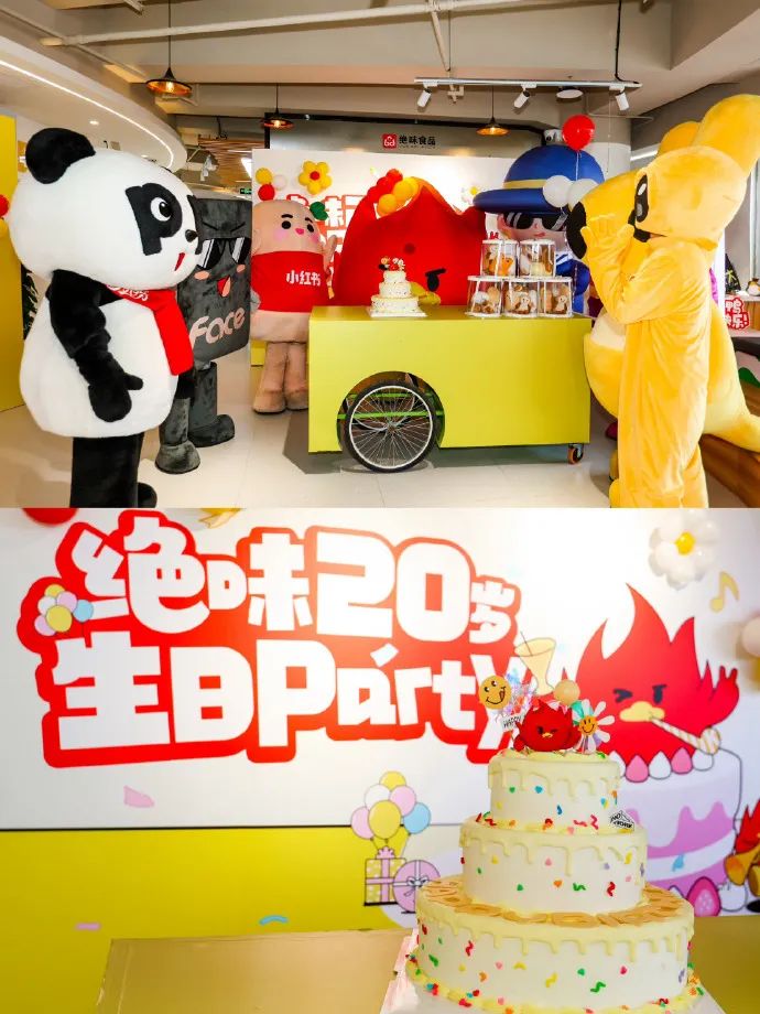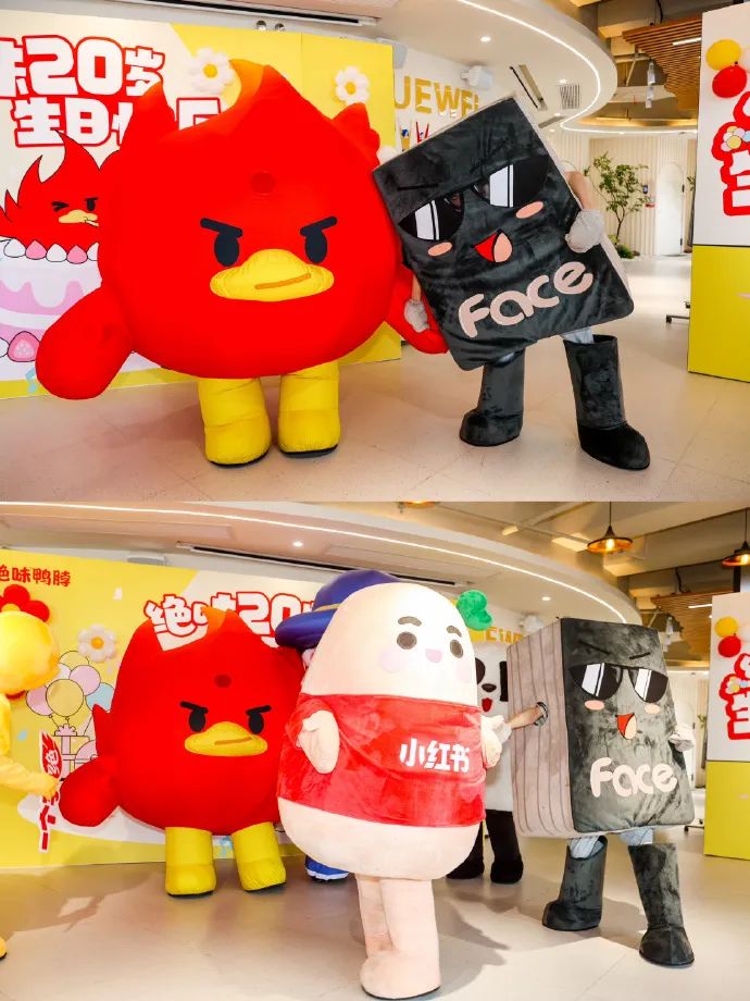 而在这一次的20周年庆中,绝味鸭脖也联动小红书、美团外卖、洁柔、卫龙、五三、零食很忙、盼盼食品等小伙伴,搞了一次人偶主题的庆生派对,再次强化了自己的“鲜活”基因。