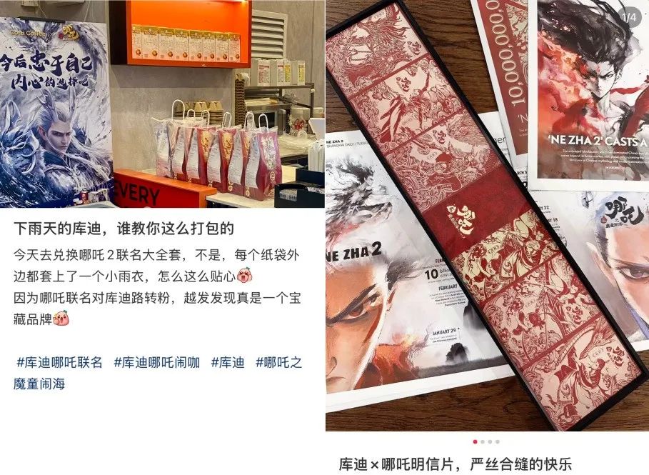 另一方面,库迪咖啡还发起「哪吒闹咖DIY挑战赛」,嗑CP粉、DIY爆改等趣味互动激发网友们的社交分享欲,优质的UGC内容不仅促成联名热度指数级增长,更带动了网友们二次创作热潮: