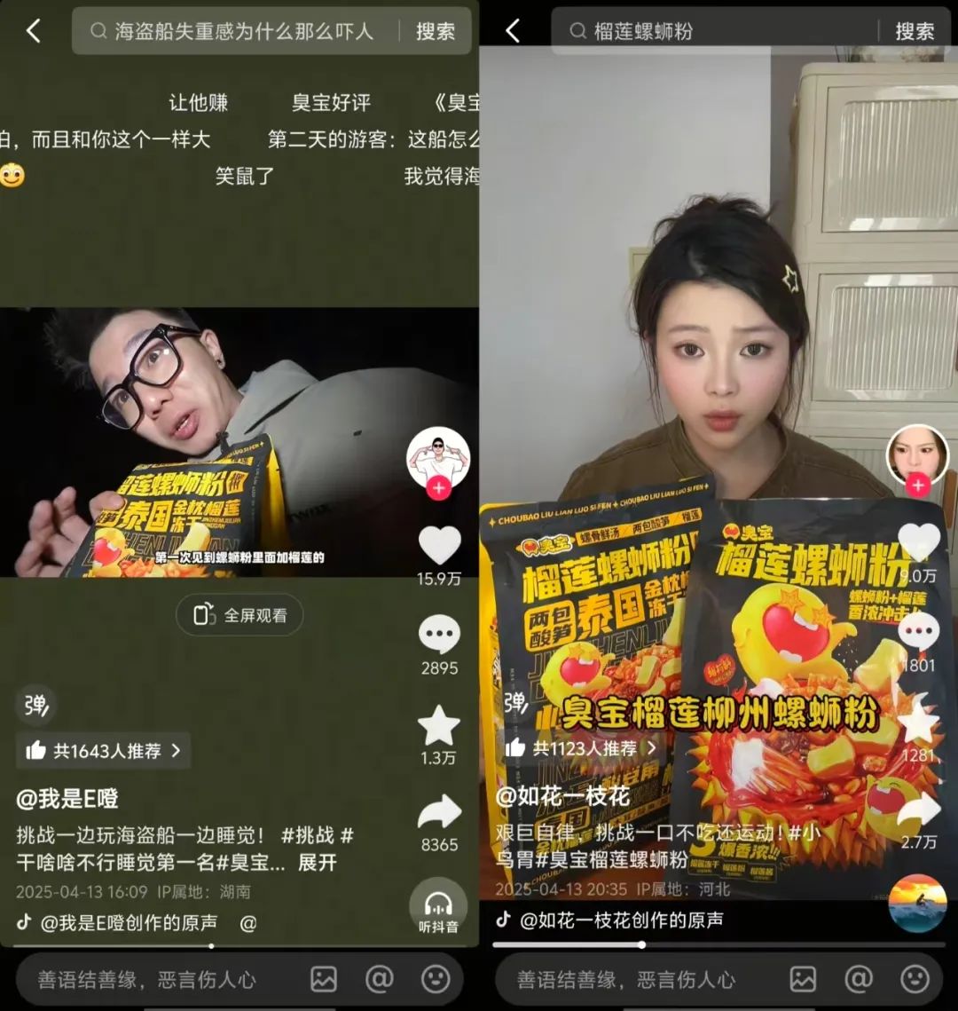 而这一切并没有消耗过多的市场预算,归根结底,最有效的媒介就是三重榴莲螺蛳粉新品本身。臭宝所做的,是把 B2B 式背书与 C 端娱乐感打包“锦上添花”,降低了话题冷启动的难度。整套打法没有一句硬广,却步步踩中“好奇—挑战—炫耀”的情绪节奏,完美呼应了“用惊喜置换流量”的成本公式。