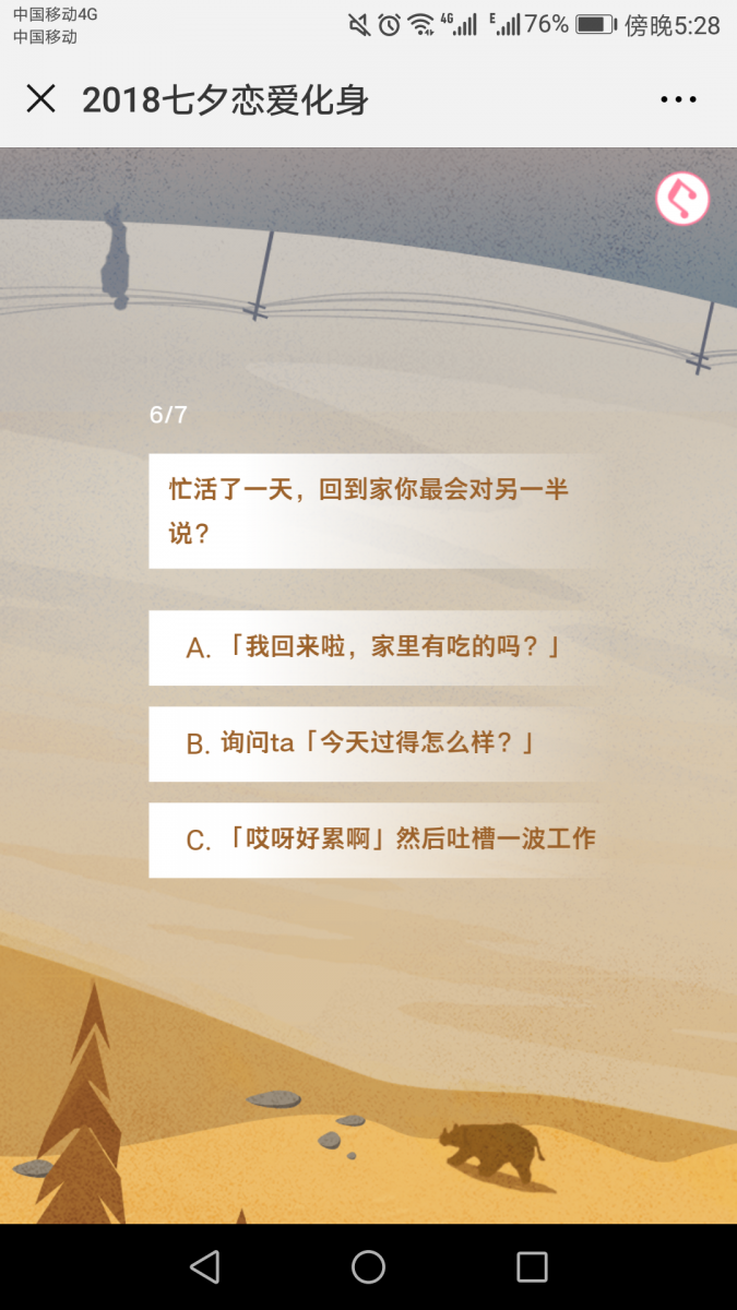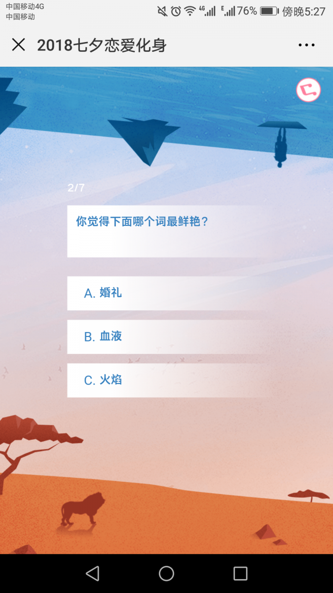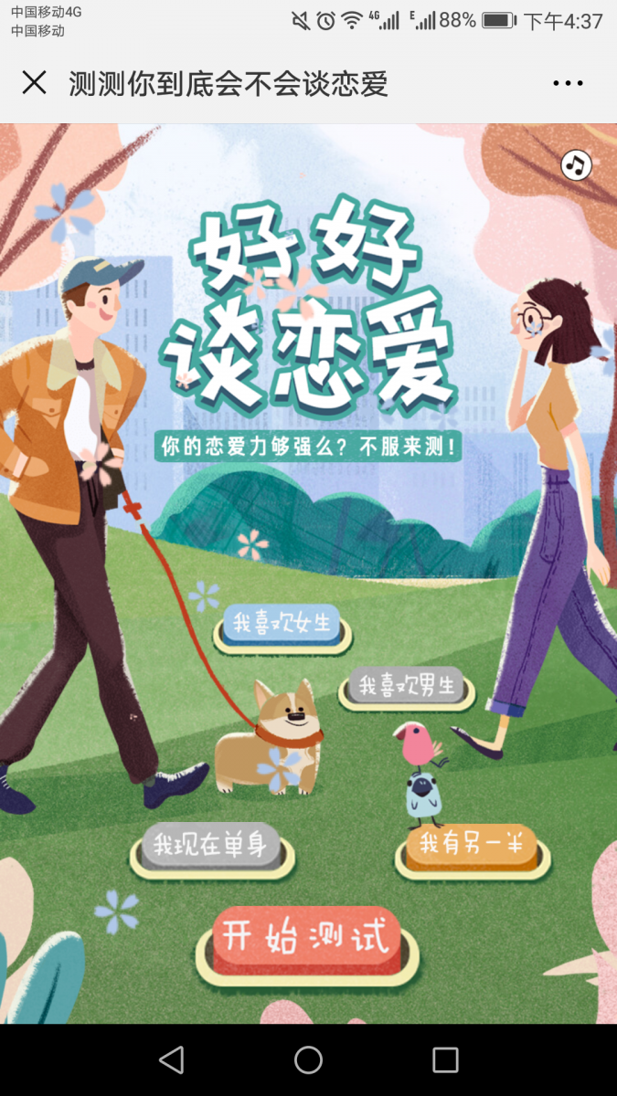 搜狗输入法&大悦城走的则是题库测试提取关键词的H5路线,通过7道测试题测试出用户的爱情化身是哪种神兽,手绘插画,配上粉蓝粉红等契合七夕浪漫主题的少女色调,清新浪漫可玩性十足。由于画面唯美、文案戳心,上线48小时,这支H5就获得了100万+的访问量。