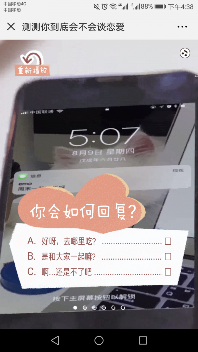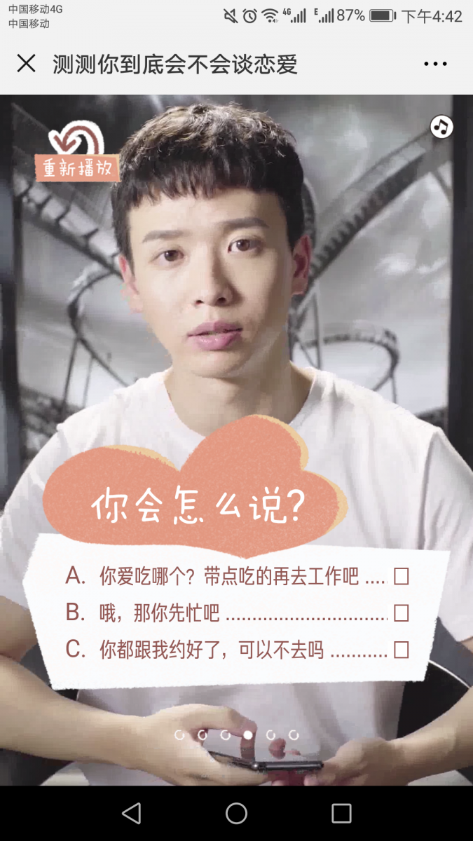 通过视频化的场景方式,将人们置身于爱情的情境中,不论你是单身还是恋爱中,都能参与这支H5,从里面的6个问题中分析你的恋爱能力,用一个科学的角度为你解决内心的问题,再加上知乎和know yourself两个知识类平台的背书,你是不是也好奇自己到底会不会谈恋爱?