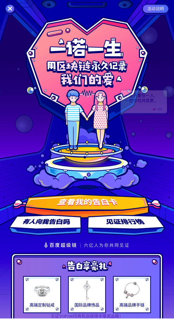 百度搜索借用技术玩了一把不一样的浪漫,推出了基于区块链技术的“一诺一生”告白活动。活动一经上线,引起强烈的用户反响,截止日前,已超过700万人参与活动。