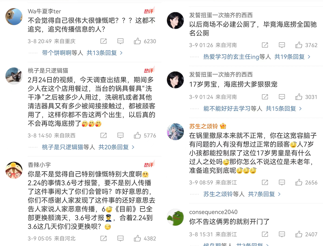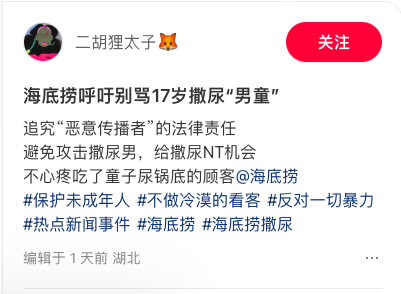 网友4:追究“恶意传播者”的法律责任 避免攻击撒尿男,给撒尿男童机会 不心疼吃了尿锅的顾客 心疼17岁撒尿男童被骂