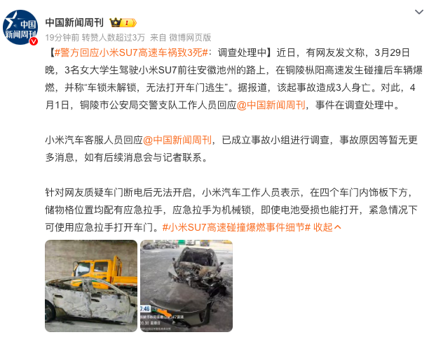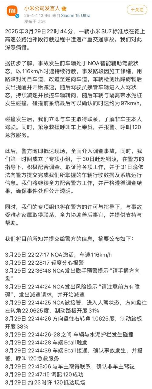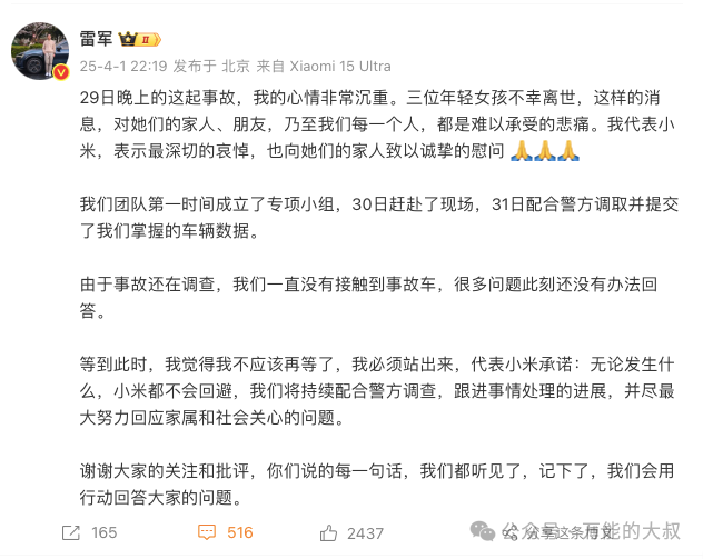 但小米在声明中“摘要公布”的“提交给警方的信息”,大叔认为,小米应该不敢作假。毕竟,这是给警方的信息,涉及了3条人命。