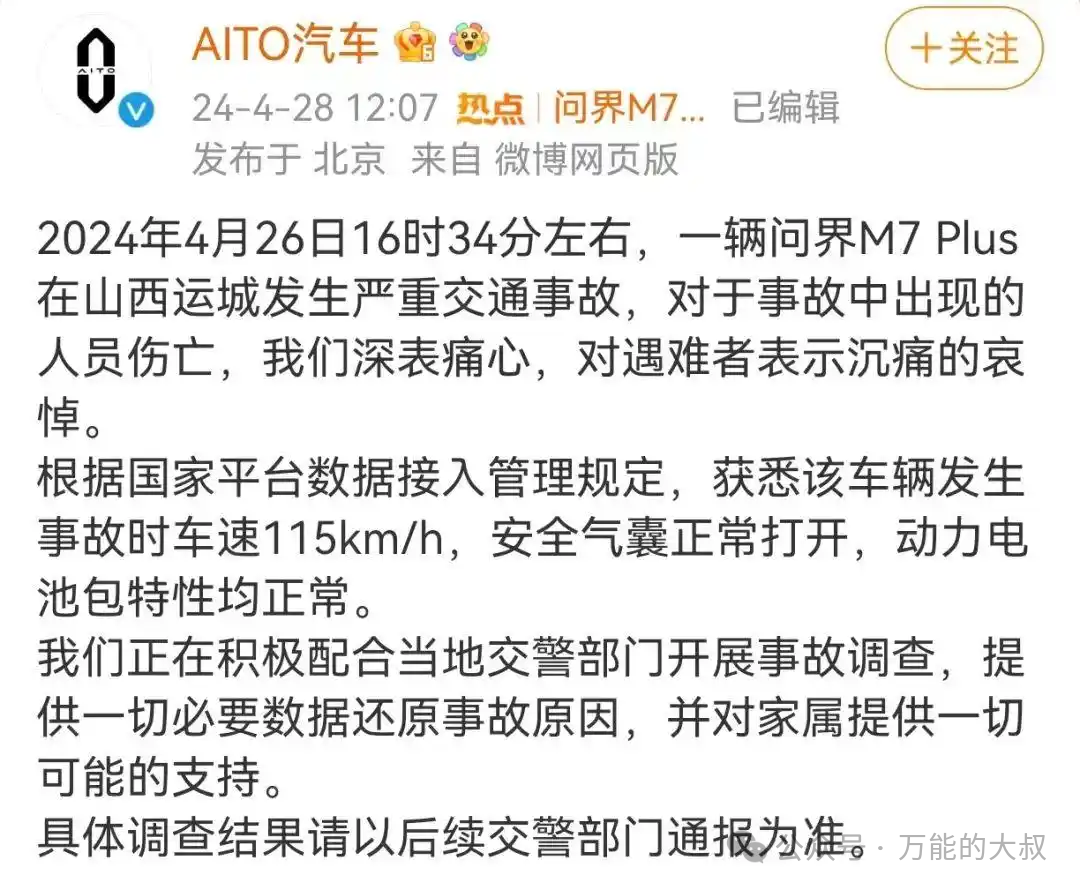 简单对比下华为问界M7针对“山西车祸”的第一封公告。