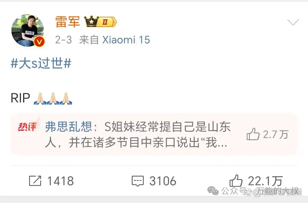 2、大S去世,雷军都发微博悼念,现在可是小米粉丝啊!