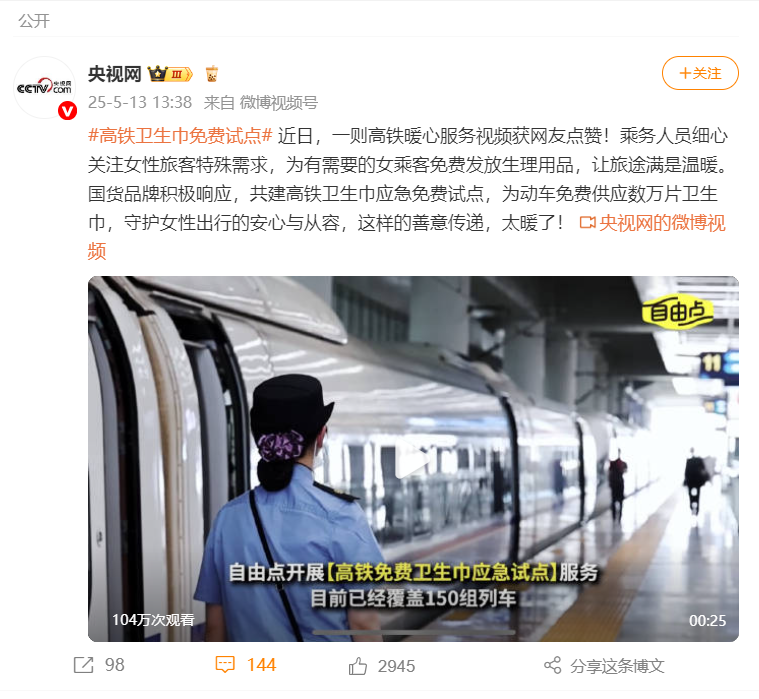 “都2025年了,为什么高铁上还不卖卫生巾?”2月,一名女性乘客突然来月经,但高铁上却买不到卫生巾,最终靠乘务员的一片护垫熬过11小时。这件事社交平台上引发热议,越来越多的女性加入“高铁卫生巾自由”的呼吁中。