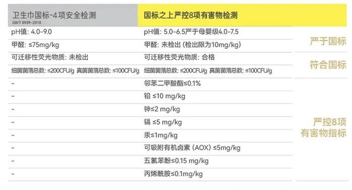 其中,pH值和甲醛都严于国标,pH值甚至严于母婴级要求,而长度、吸收量、吸收速度、背胶粘度、无污物等方面均超出国标要求,并新增铅、汞等8项国标之上的有害物指标检测。