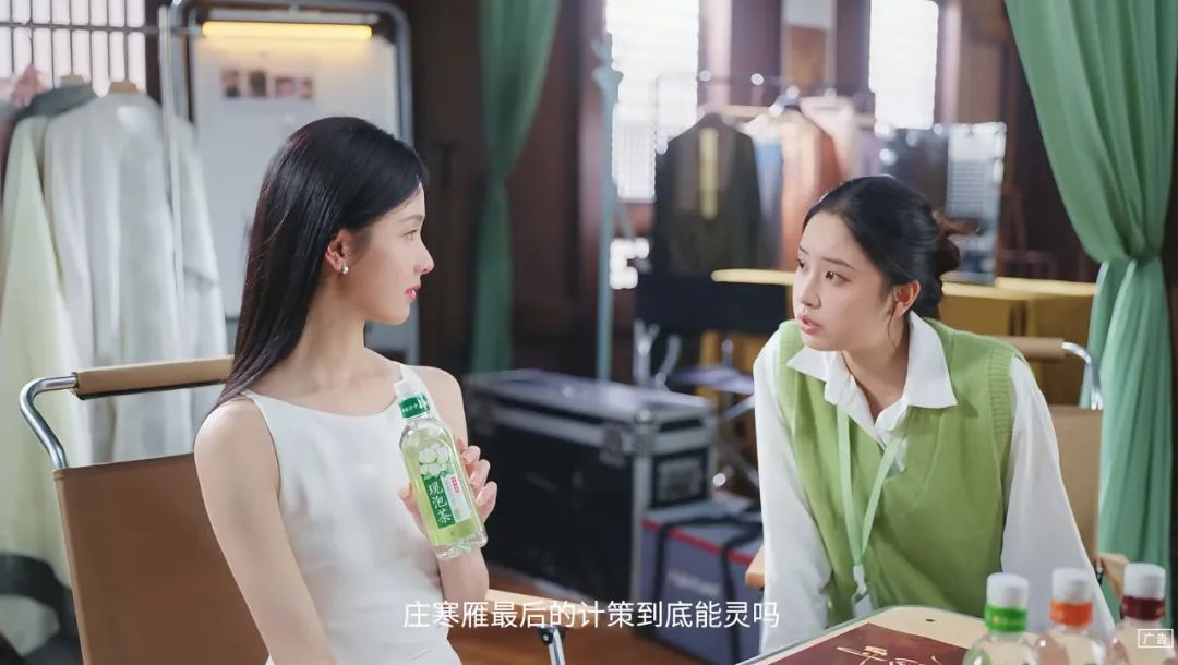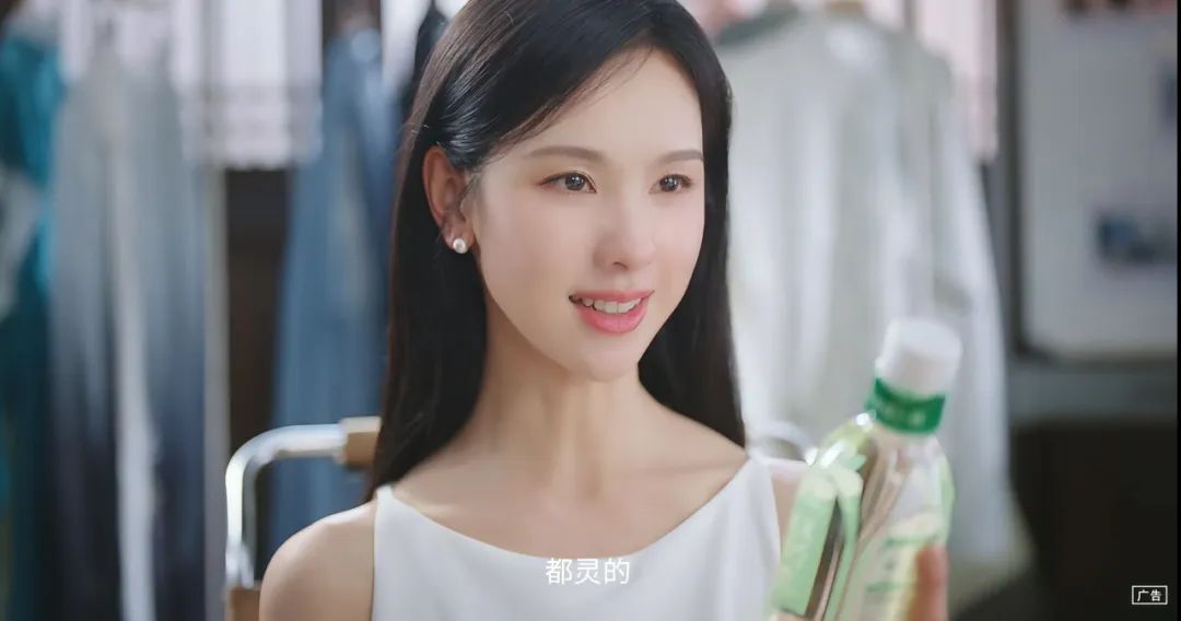 在广告画面中,陈都灵拿着一瓶茉莉花茶,干净的配色给人带来了一股清新感,而广告语却非常接地气“都灵的茶,都0的”,获得了网友的热评。