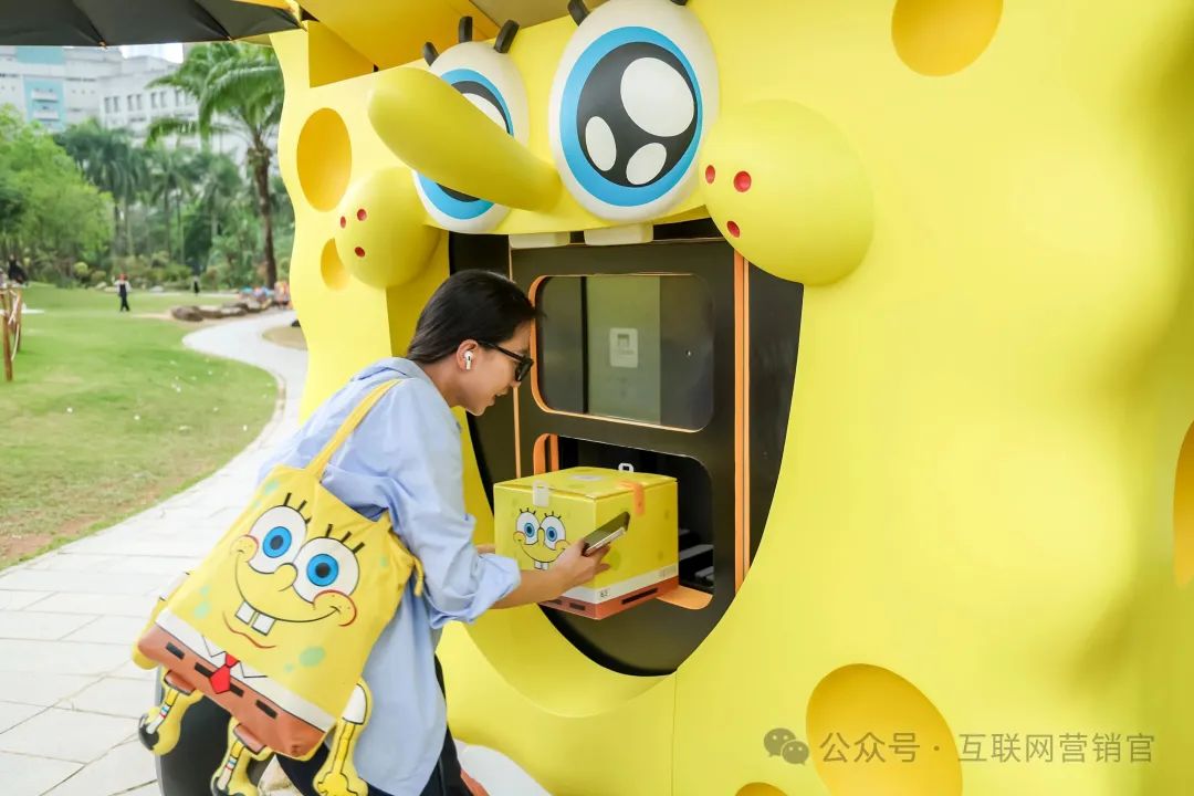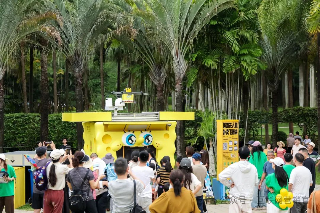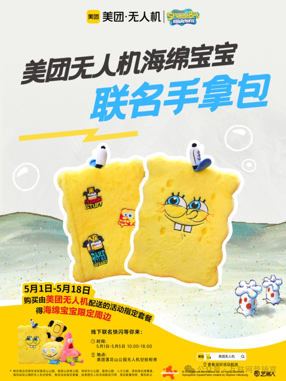 在线下体验场,美团无人机对莲花山公园等深圳7大公园的无人机空投柜进行限时“换装”。当可爱的海绵宝宝形象与科技感十足的无人机、空投柜相结合,由此,赋予科技亲民、有趣的形象,在最大程度上以“科技的人文情怀”打动消费者。