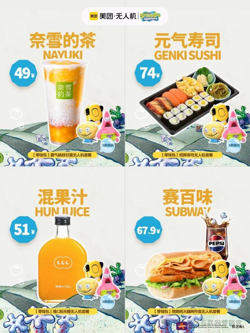 不仅如此美团无人机与元气寿司、混果汁、奈雪的茶、SUBWAY 等知名品牌合作推出联名套餐,给予消费者多元的消费体验,随餐附赠的海绵宝宝联名周边更是拿捏消费者的兴趣锚点,催生更多消费行为的发生。