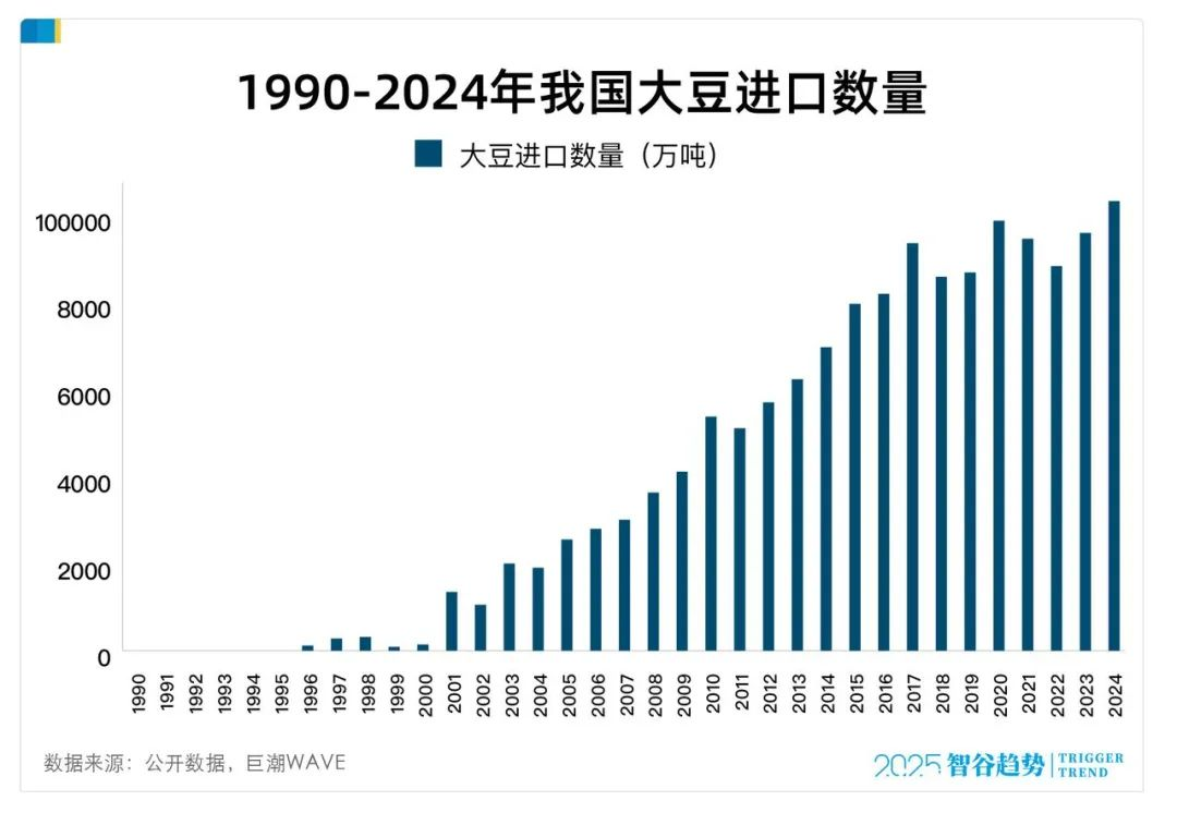 在国民营养需求暴涨的今天,中国食用油年消费量约4000万吨,但是目前,我国食用油的自给率不到30%,三分之二以上需要依赖进口。而且在国人之前的饮食结构中,光是大豆油就占了近一半的比例,仅在2024年,中国就消耗约1.17亿吨大豆,这个数字的背后是更触目惊心的供给黑洞:国产大豆的自给率不到20%,剩下八九成都需要依赖进口。