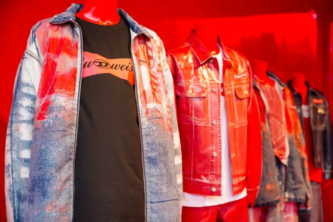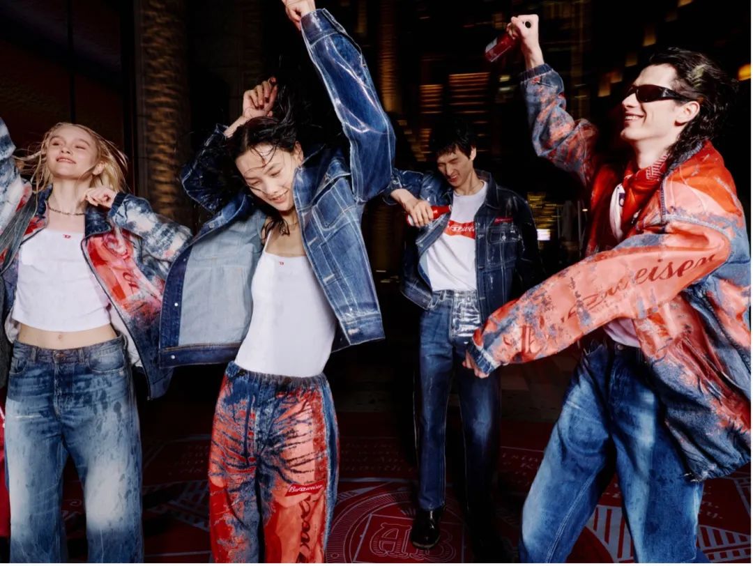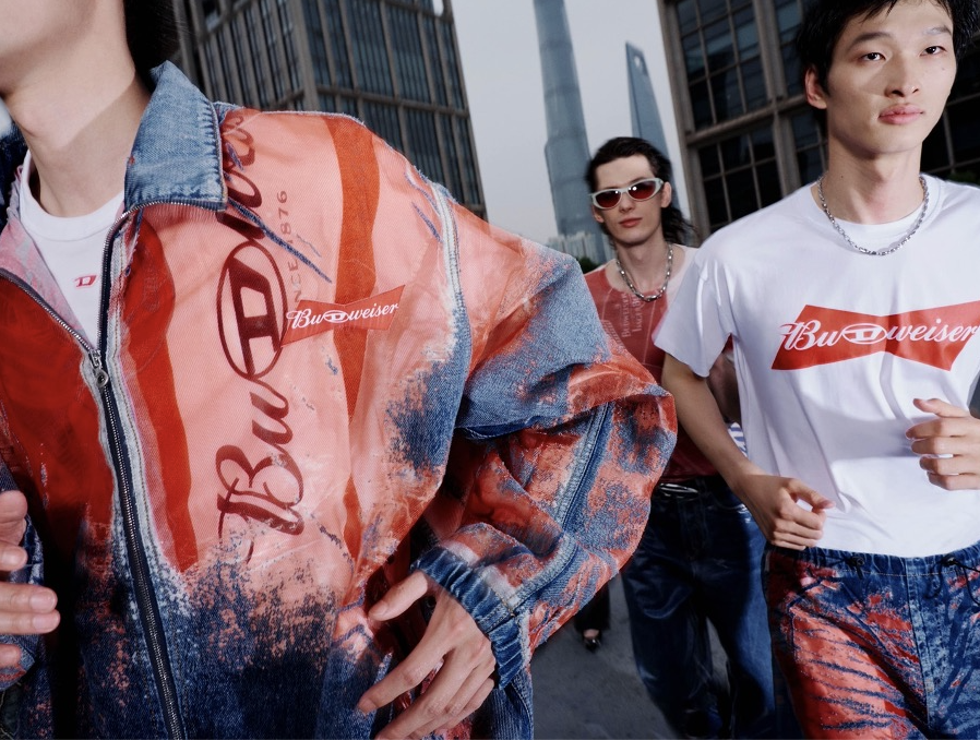 红色,是这次合作的直接契机与灵感核心。15 件限量单品中包括全红牛仔套装、酸洗 T 恤等,将百威的红,以 DIESEL 一贯先锋前卫的方式用服饰表达了出来。