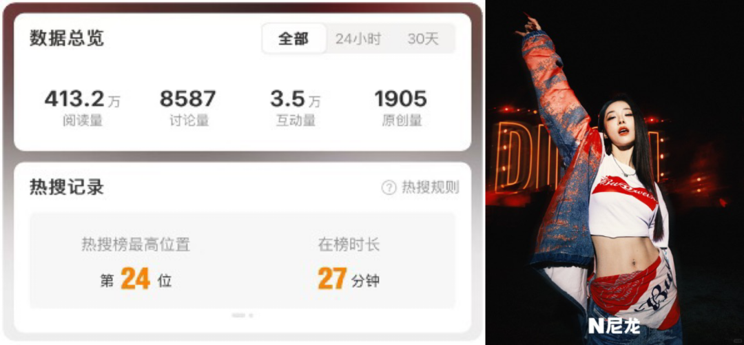 首先是身穿联名服饰的尼龙特派员——喻言;她碰撞上热烈的百威红,气场全开,点燃全网。登榜微博热搜总榜第 24 名,微博文娱榜第 20 名。