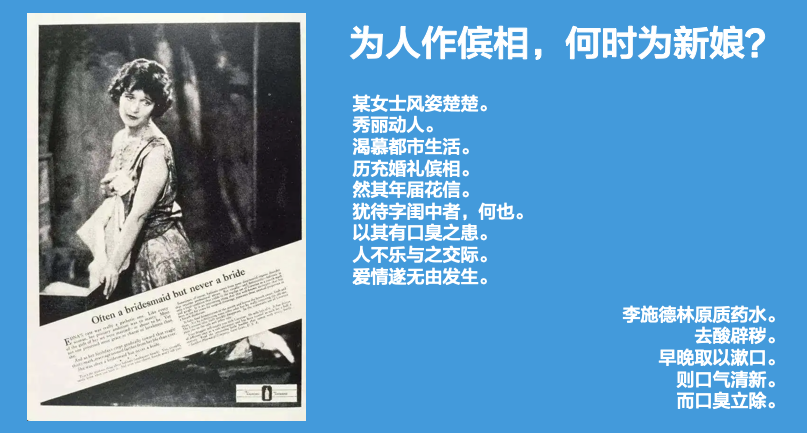 “把问题严重化”是早期扬·罗必凯提出的广告解题思路。比如强化“口臭”为“恶臭”,以此推销李斯特林漱口水;强化咳嗽的害处,“咳嗽是社交的一个障碍”,以此推销史密斯兄弟牌咳嗽糖浆。