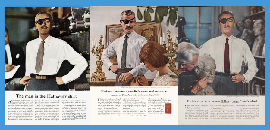 由此逐渐建立起“品牌资产”的概念。代表作品为“穿海撒威衬衫的男人”,一个眼罩男吸引注意力,建立了海撒威与众不同的气质。