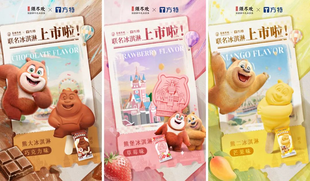 联名冰淇淋带来一场视觉与味觉的奇幻之旅:在造型上,产品巧妙融合方特经典的熊出没IP;在文化上,须尽欢的国风美学与方特的现代乐园文化相互碰撞,平衡了“国韵”与“童趣”的双重特质。