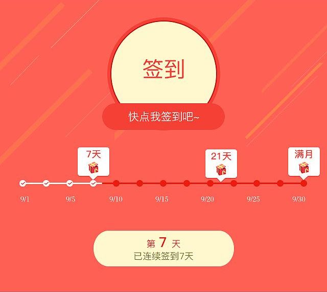 很多微信公众号和有赞商城,为增加粘性,鼓励用户每天来逛,做了签到小程序:每天签到送10积分,连续签到7天再送50积分,100积分可兑换10元现金券。