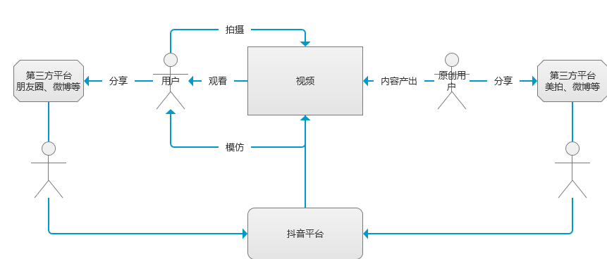抖音的业务形态,我们化繁为简,去掉旁支看主脉,主要就是-用户观看视频、拍摄视频、分享视频的业务循环。