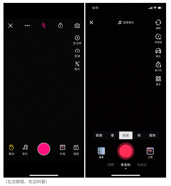 另外可以发现抖音在拍摄操作上,给了用户更多选择,结合音乐短视频的特点给了不同的节奏快慢选择,功能上仅贴定位,把用户拍摄有趣潮流的音乐视频的需求放第一位,反观微视,就有点像”美图秀秀“了。