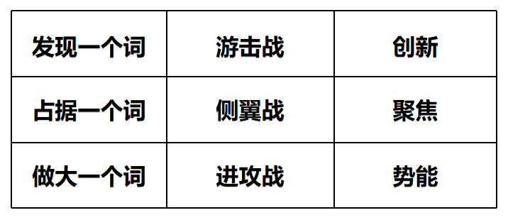 《品牌定位通识》中提出要发现一个词、占据一个词、做大一个词。分别对应的就是游击战、侧翼战和进攻战。发现一个词,核心是创新;占据一个词,核心是聚焦;做大一个词,核心是势能。