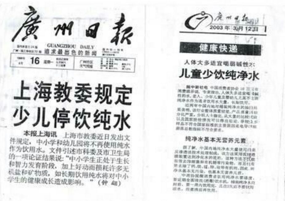 在媒体上发起 “饮用纯净水毁掉一代人” 的公关话题,给纯净水起了 “刮骨水” 的名字。明示消费者纯净水不仅不会补充矿物质,还会带走体内营养成分,造成骨质疏松。