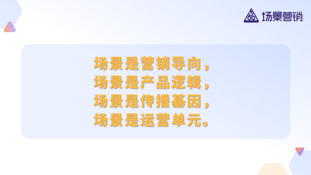 再简单解释四句话:场景是营销导向,场景是产品逻辑,场景是传播基因,场景是运营单元。