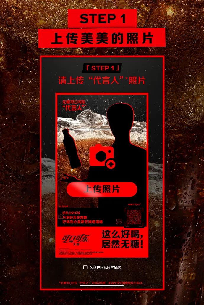 2024年3月,无糖可口可乐推出“AI代言人”活动,消费者上传照片就可以生成自己代言无糖可乐的海报,分享可赢礼品,且有机会获赠一年的免费可乐。而该海报的模版和海报中出现的产品元素、文案都是预设好的,消费者只需附上个人肖像照即可。