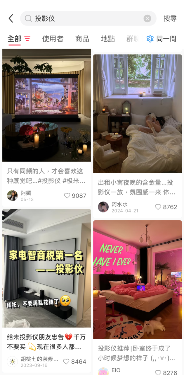 就拿投影仪来说,该品类在种草时常用关键词是“一个人的家庭影院”“宅家幸福感”“下班后的终极享受”等。这一场景营造让人想象:在下班后、在周末,躺在床上或窝在沙发里,打开一罐饮料一袋零食,舒舒服服地看一部喜欢的电影那种情形,这正是打工人梦寐以求的理想生活图景。