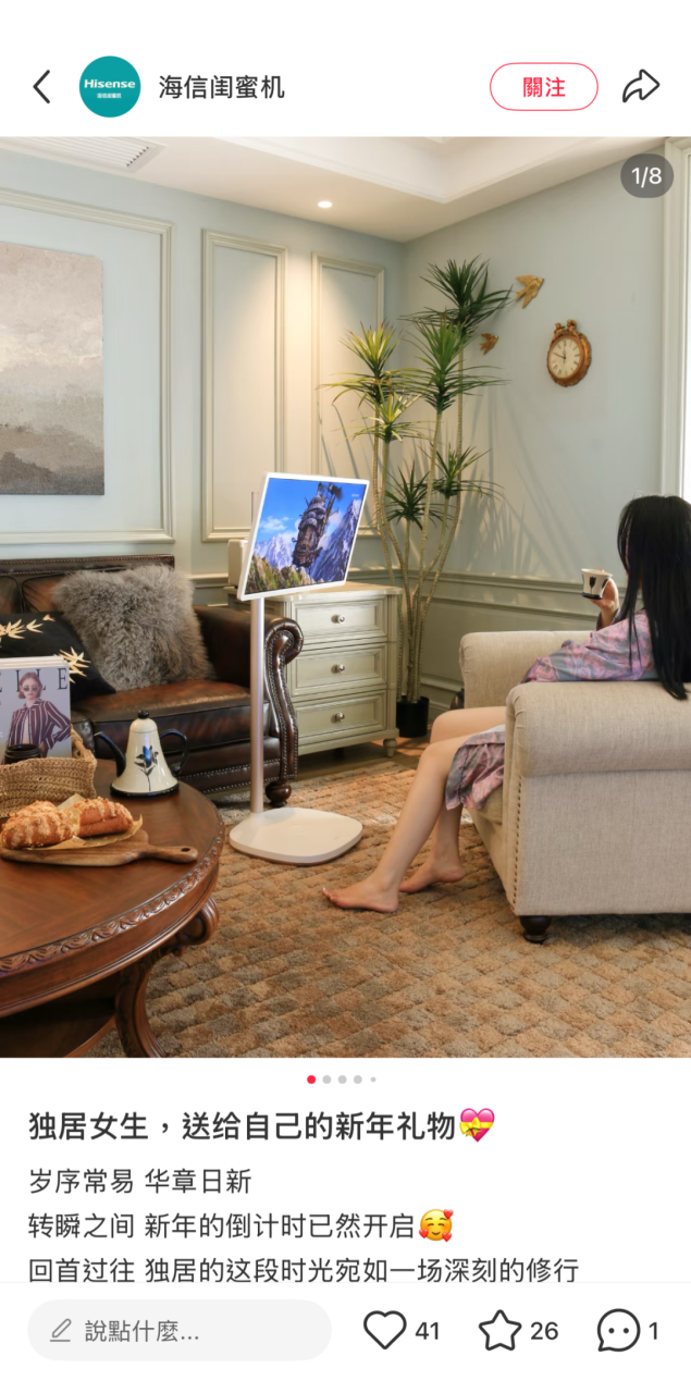 再如“闺蜜机”,2024年最火的电子产品之一。它其实是一种带落地支架、可移动的大号平板电脑,内置游戏、运动、追剧等。叫“闺蜜机”这个名字,强调该产品针对女性家居场景,不仅是功能性大屏,更能为用户提供闺蜜式情感陪伴,成为独居女性的“电子闺蜜”“宅家电子宠物”。