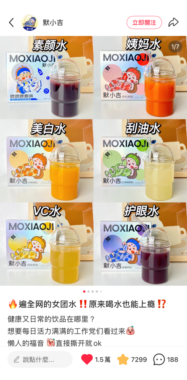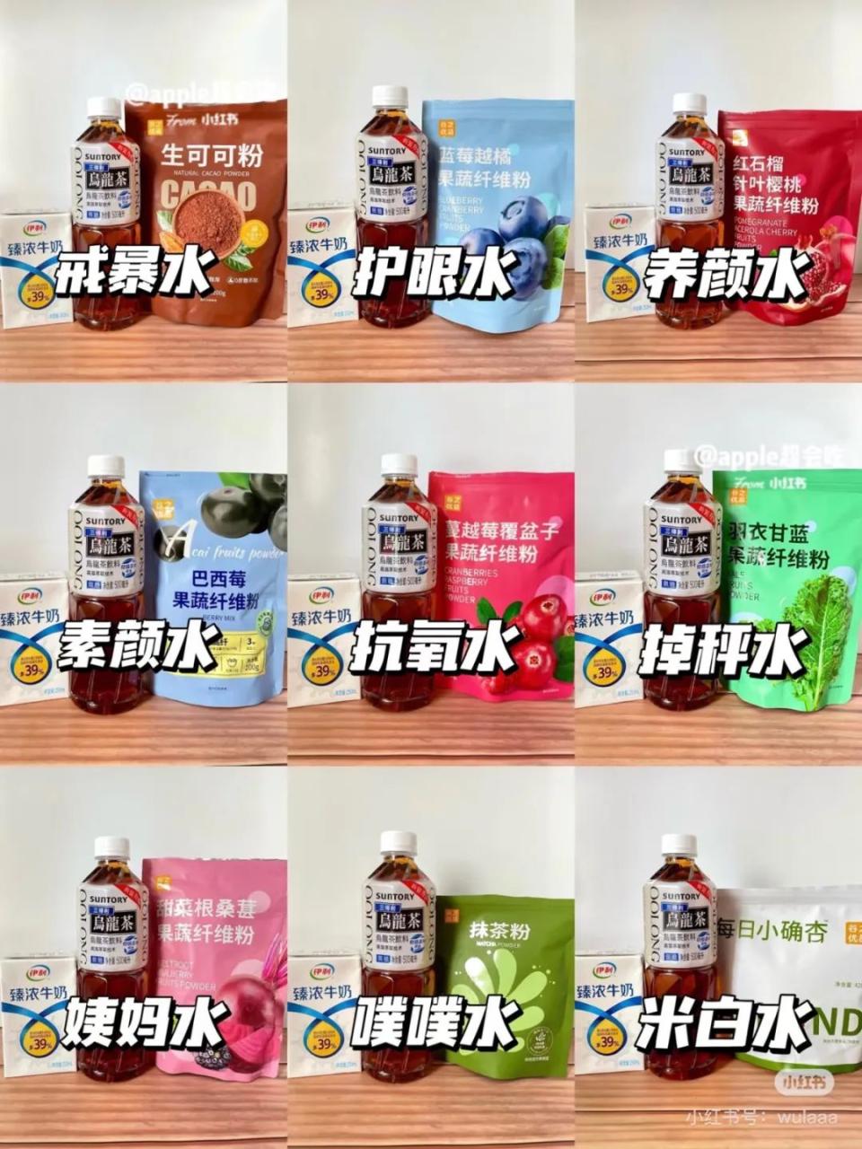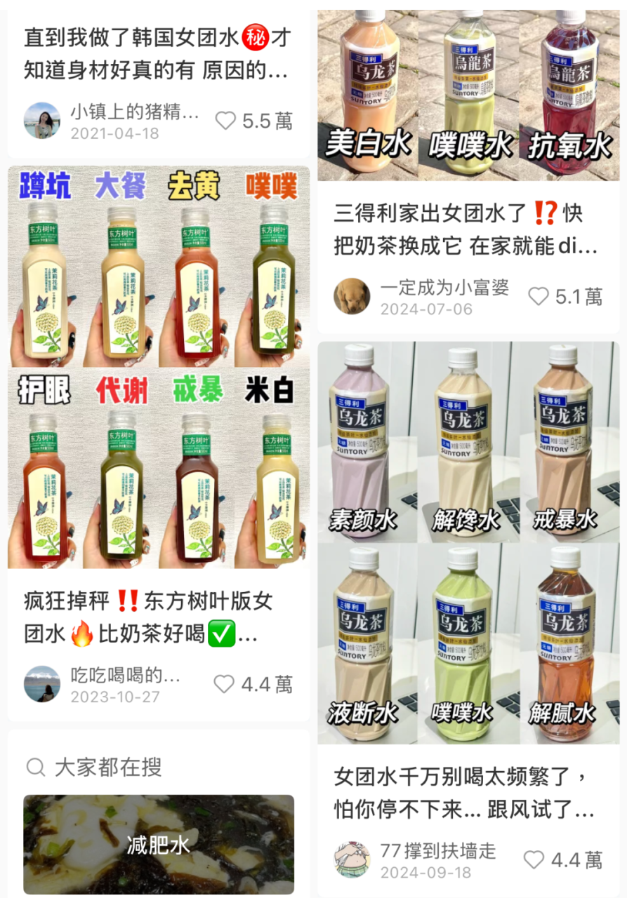 针对消费者生活中更多具体而微的场景,“女团水”还衍生出了一系列产品配方如解腻水、刮油水、掉秤水、噗噗水、姨妈水、护眼水、素颜水、美白水、戒暴水等等。这就为自媒体博主们提供了一个内容框架,便于他们基于这一模版来创作,发布针对具体场景的饮品配方和制作方法,分享成品效果和饮后体验,描述可见好处和自身经历等。