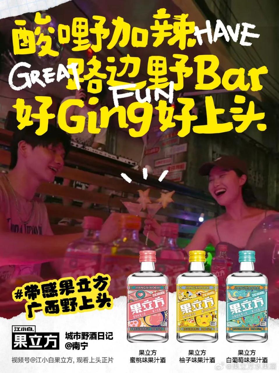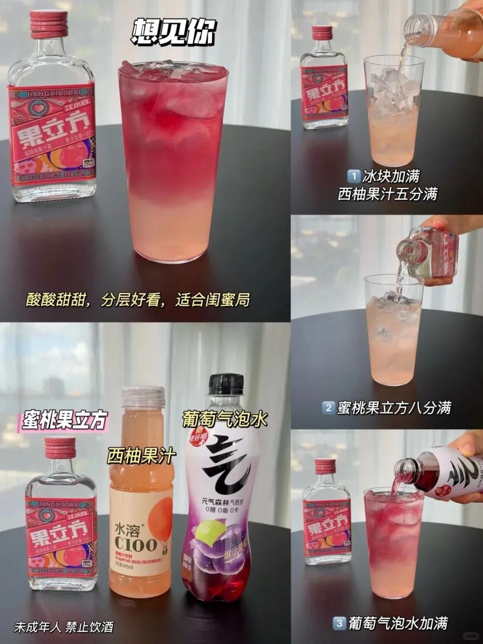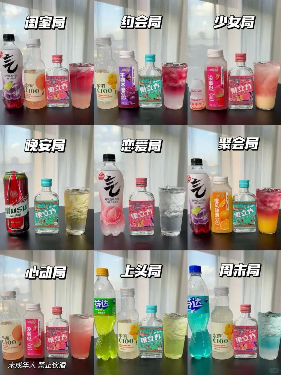 再后来,一些酒精饮料如RIO、果立方,甚至啤酒、白酒等都开始借鉴这一玩法。比如果立方兑元汽森林气泡水一起喝叫做“闺蜜局”,兑茶Π叫“晚安局”,兑RIO强爽叫“失恋局”,兑旺仔牛奶叫“摸鱼局”等,由此形成大量调酒配方,衍生海量内容,激发消费者模仿、DIY。