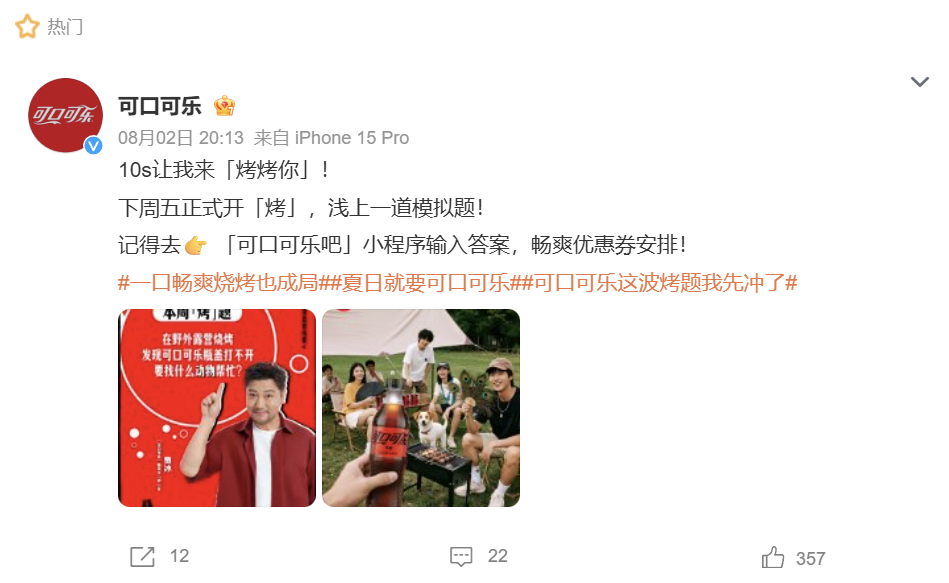 在微博上,可口可乐还打造了热点话题“可口可乐这波烤题我先冲了”,引发用户广泛讨论和积极参与,进一步扩大了社交传播。这就是场景指导下的销售转化内容。