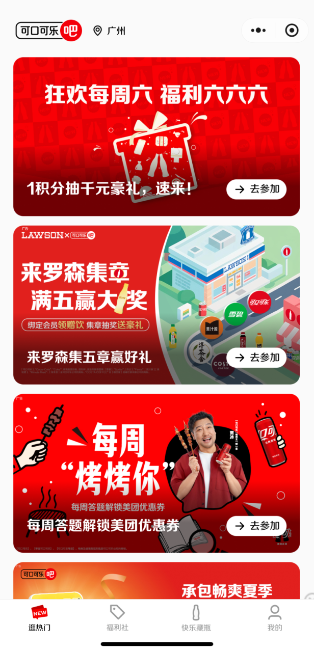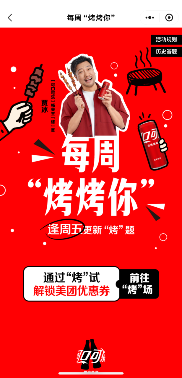 该活动设置了固定的时间节点,逢周五更新“烤”题,消费者需通过“可口可乐吧”小程序答题,再通过美团小程序兑换产品优惠及合作商家福利,直接下单购买。