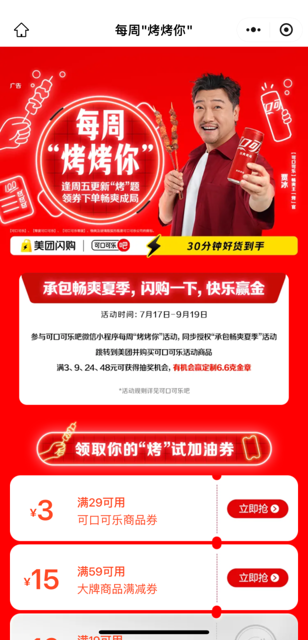 还是烧烤场景,2025年8月可口可乐还推出了强促销性质的互动活动——每周“烤烤你”。可口可乐用双关方式把“考卷”变成“烤券”,围绕烧烤设置趣味内容,吸引消费者答题互动,答对即可获得优惠券。