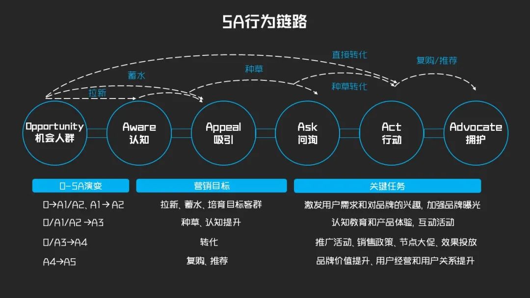 一切品牌建设、营销推广的做法,最终要回到消费者的行为模式上。这句话可能是我重复最多的一句话。按照科特勒老爷子提出来的5A行为链路,消费者从知道品牌到购买、与品牌建立关系需要经历5个阶段:Aware(认知)→Appeal(吸引)→Ask(问询)→Act(行动)→Advocate(拥护)。
