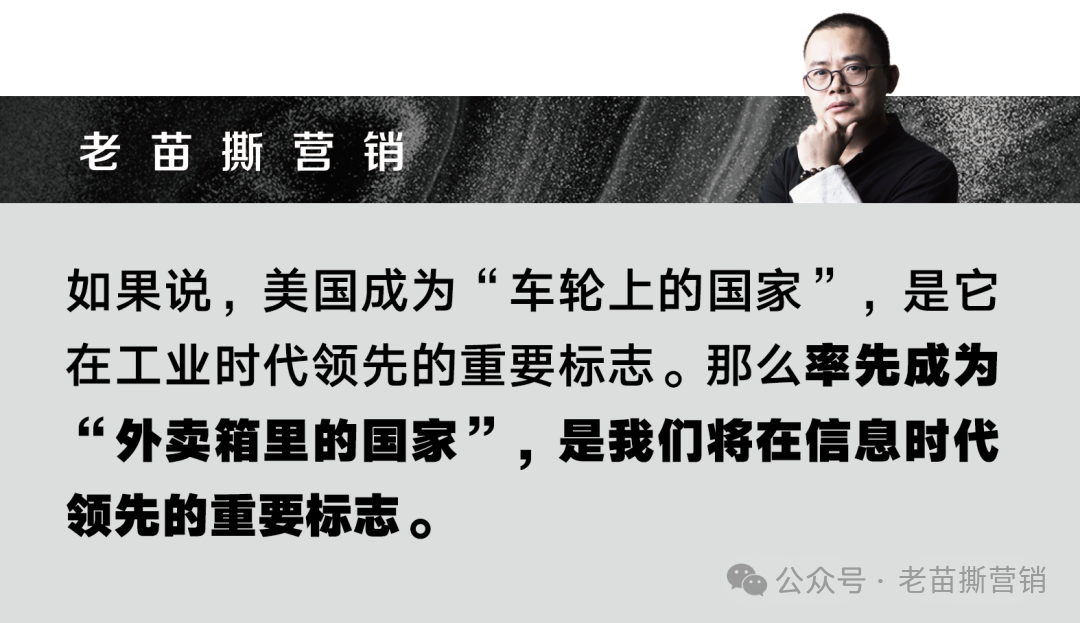 如果说,美国成为“车轮上的国家”,是它在工业时代领先的重要标志。那么率先成为“外卖箱里的国家”,是我们将在信息时代领先的重要标志。