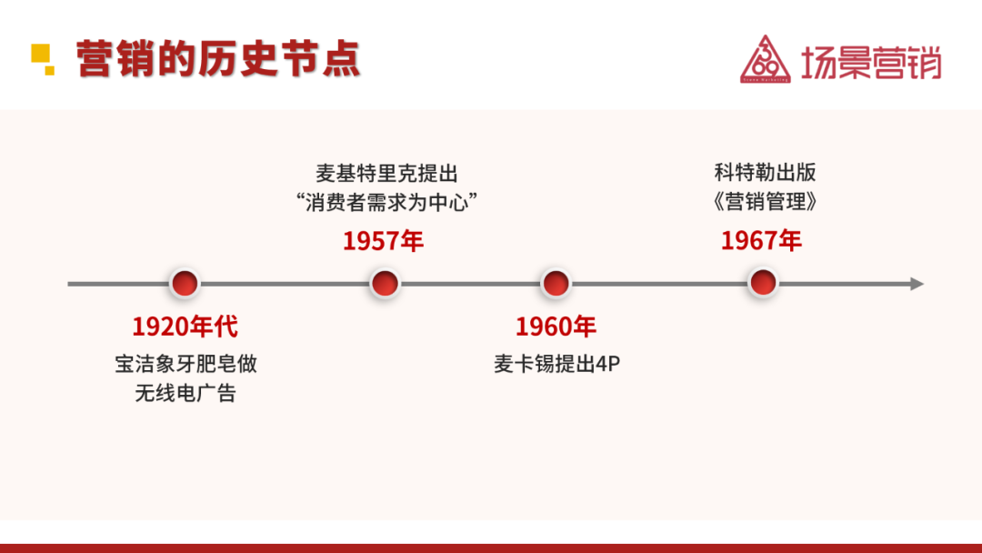 1957年,通用电气的约翰·麦基特里克提出“市场营销概念”哲学,首次明确提出企业应从“以产品为中心”转向“以消费者需求为中心”。