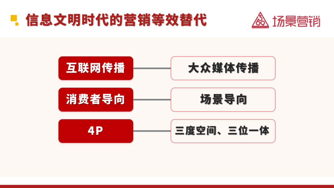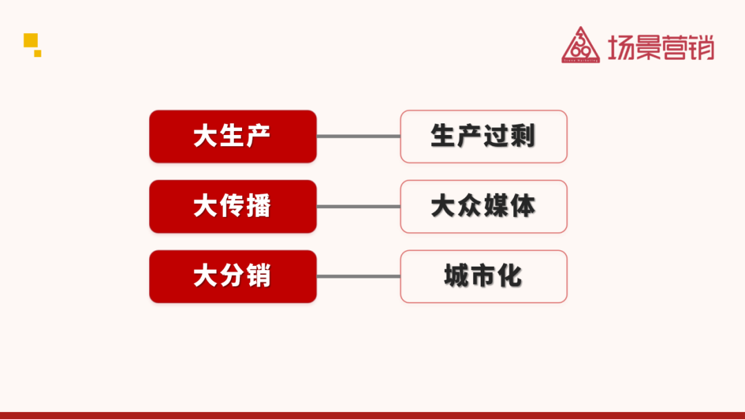 因此,大生产,大传播,大分销,对应的基础设施是工业化大生产,大众媒体,城市化。一个社会的基础设施决定了营销的形态。