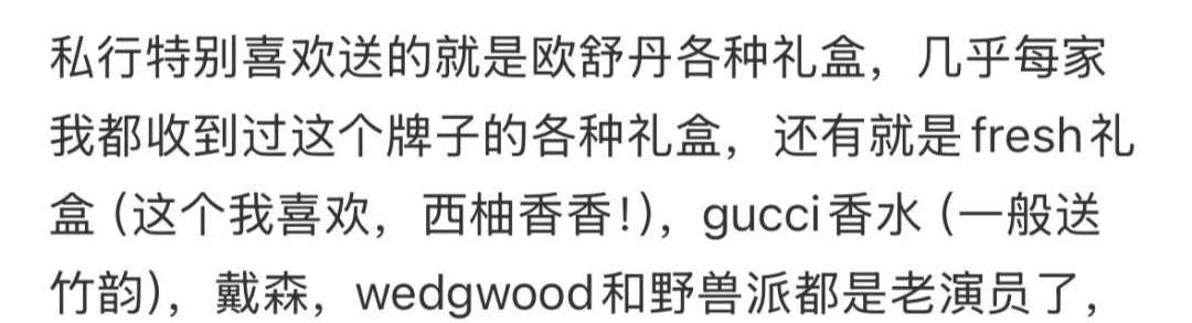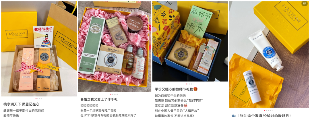 再说高端礼品市场,很多品牌都说自己有礼品这个特渠,可是产品的SKU里往往连个礼盒都没有。真正要去做礼品特渠,也是一种战略决策。欧舒丹这些年在“礼盒”上花的心思,绝不比很多品牌在产品上花的心思少。我们从顾客的碎碎念里也能看到,作为礼品,它总价不高,但单价很高级,东西不多,但盒子很精致,完美符合了很多特殊场景下“伴手礼”的需求。这些巧妙的设计,如果不是真的花时间扑在礼品渠道里挖掘研究,是断断做不出来的。这些礼盒,源源不断被送到礼品的经销商那里、山姆会员店里。随着顾客的手手相传,出现在办公室、婚礼、节日等具体场景中,在每一次的赠予与接收中,“欧舒丹是高端品牌”的品牌信息,在私域中被一次次的传递。