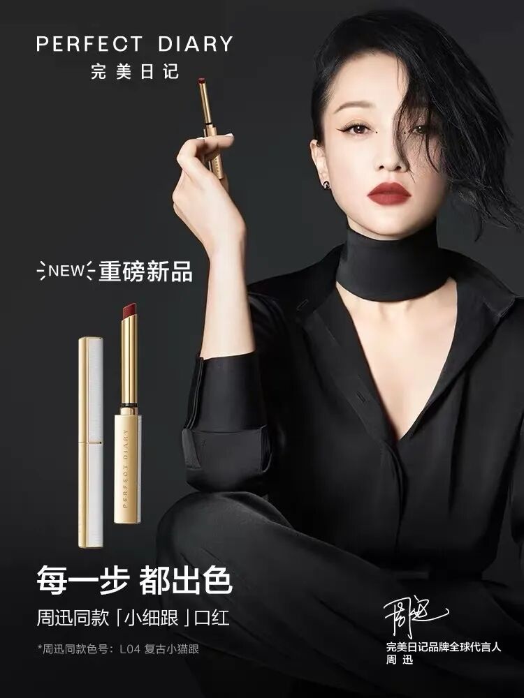 比如2020年完美日记推出升级产品“小细跟”口红,官宣周迅成为品牌首位代言人,并且打造了“每一步 都出色”的品牌片进行投放,强调女性态度与自信力量。
