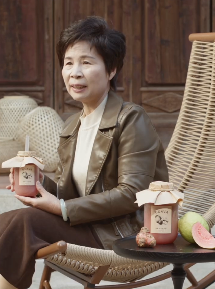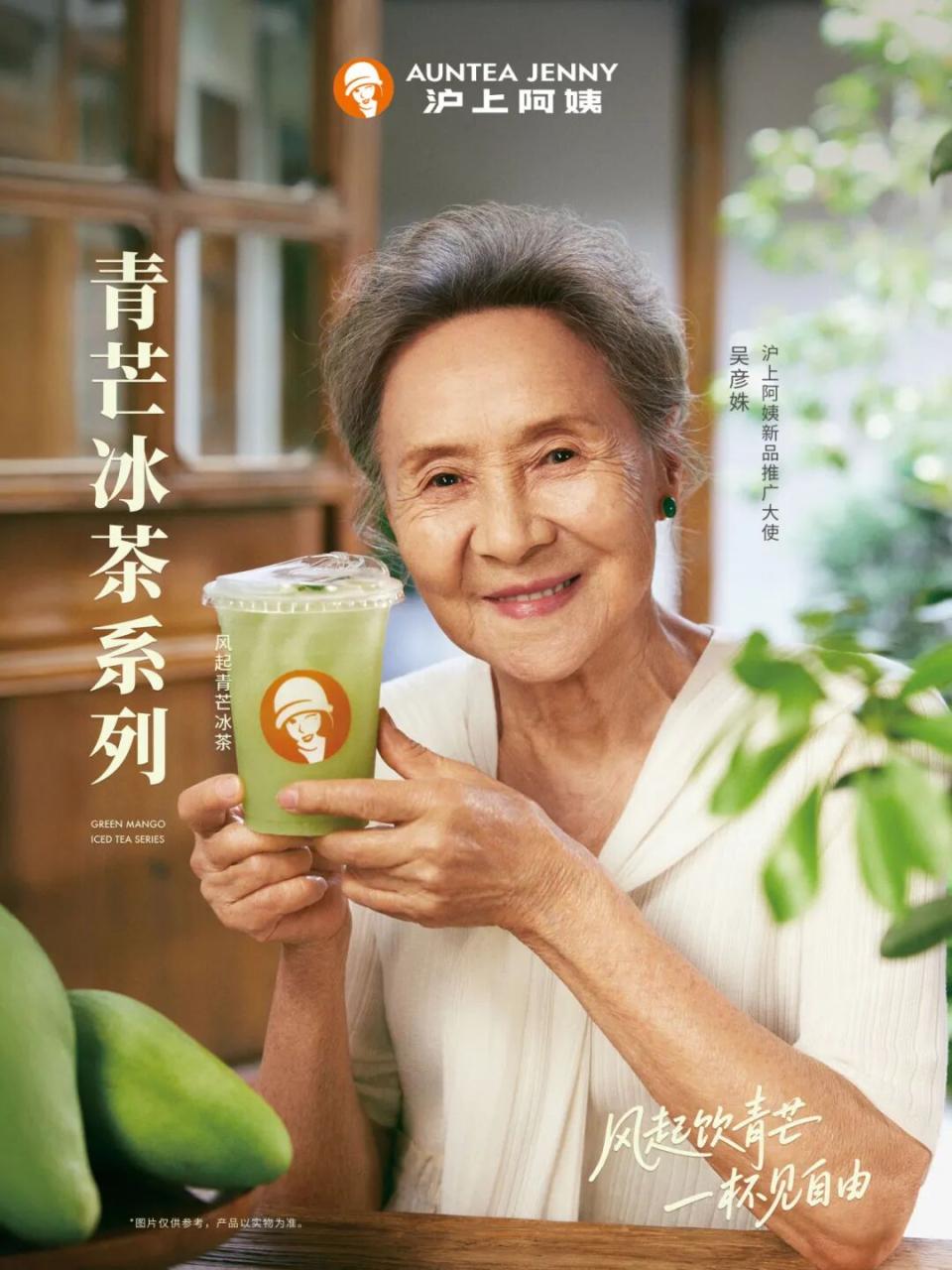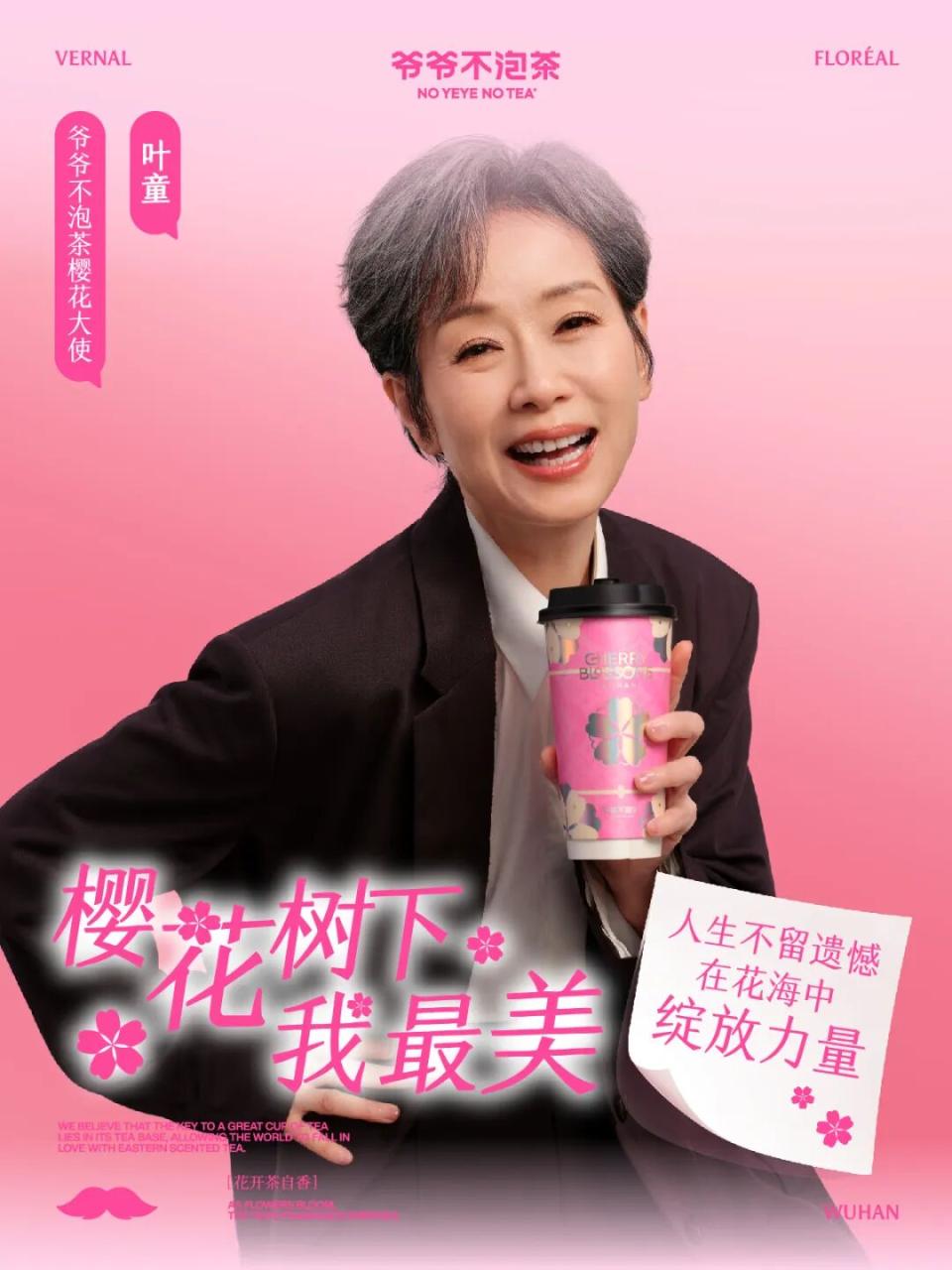 今年3月份,爷爷不泡茶请了62岁的叶童担任品牌樱花大使,喜茶与60岁的潮汕网红“如姨”(李德如)联名推出新品南姜甘草芭乐瓶,7月初,沪上阿姨又请了86岁的吴彦姝推广新品。