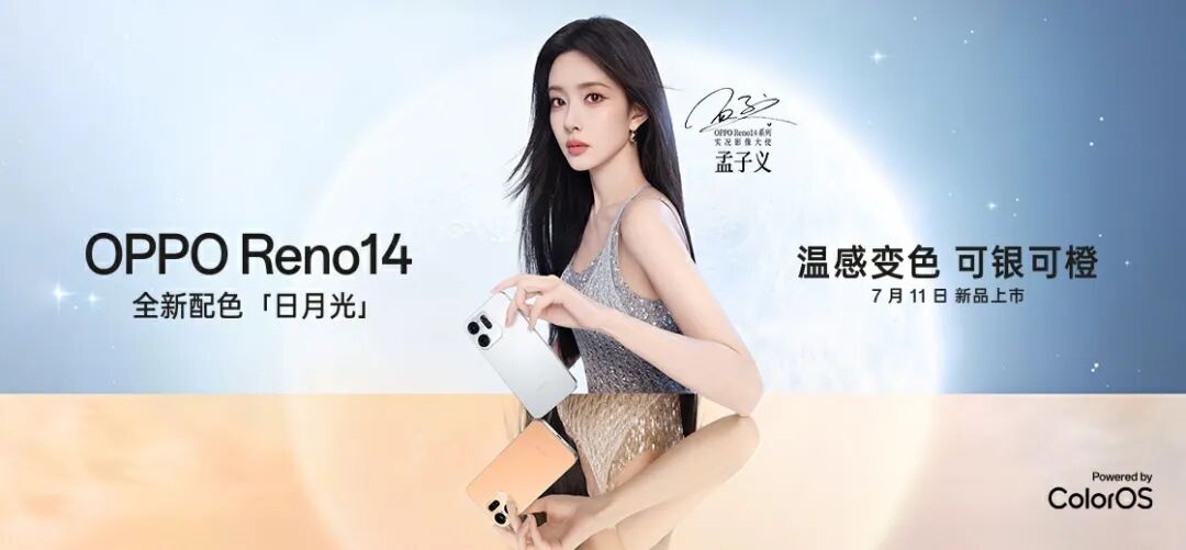 比如OPPO Reno14今年7月推出新配色版本白月光,就请了孟子义担任产品实况影像大使,并与《时尚芭莎》合作打造主题大片,展示温感变色工艺带来的科技时尚感。