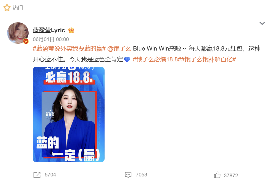 比如“外卖大战”中,美团请黄龄代言,广告语叫做“外卖黄的更灵”;饿了么随即官宣蓝盈莹代言,强调“蓝的一定赢”;于是网友们给京东建言献策去请惠英红代言,因为“红的会赢”。而京东外卖也顺势听劝,真的请了惠英红,此举迅速引发网络热议。