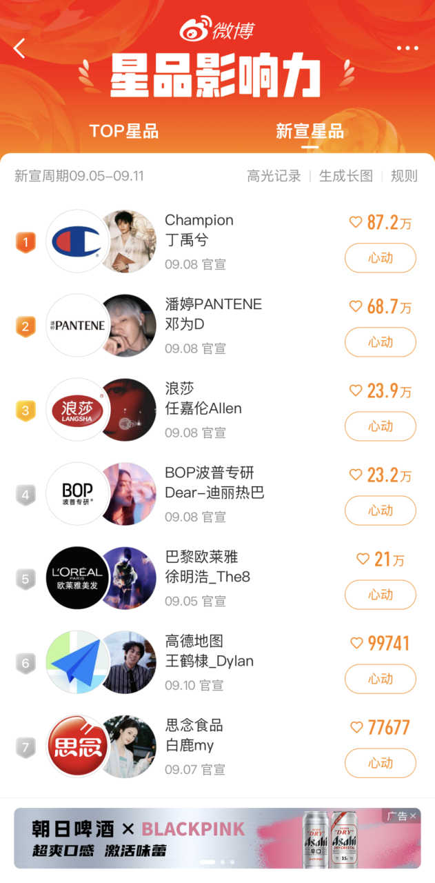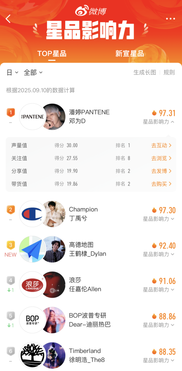 拿明星们最爱入驻的社交平台微博来说,微博产品“星品影响力”就可以详细了解一位明星的声量值、关注值、分享值、带货值等;还能看到明星们最新官宣代言的榜单,了解不同品牌的最新营销动态和代言人的心动值等。